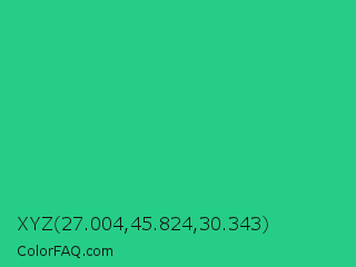 XYZ 27.004,45.824,30.343 Color is a normal green color and the nearest color is Shamrock #33cc99. Hex code #26cd87 and RGB value is rgb(38,205,135). In RGB color space, this color is composed of 15% red, 80% green, 53% blue, In CMYK color space, this color is composed of 81% cyan, 0% magenta, 34% yellow , 20% black , In HSL color space, this color has a hue angle of 155° , 69% saturation and 48% lightness.