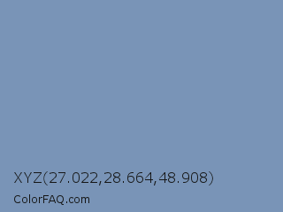 XYZ 27.022,28.664,48.908 Color is a normal blue color and the nearest color is Ship Cove #788bba. Hex code #7994b7 and RGB value is rgb(121,148,183). In RGB color space, this color is composed of 47% red, 58% green, 72% blue, In CMYK color space, this color is composed of 34% cyan, 19% magenta, 0% yellow , 28% black , In HSL color space, this color has a hue angle of 214° , 30% saturation and 60% lightness.