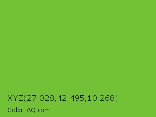 XYZ 27.028,42.495,10.268 Color is a normal green color and the nearest color is Green RYB #66b032. Hex code #73c236 and RGB value is rgb(115,194,54). In RGB color space, this color is composed of 45% red, 76% green, 21% blue, In CMYK color space, this color is composed of 41% cyan, 0% magenta, 72% yellow , 24% black , In HSL color space, this color has a hue angle of 94° , 56% saturation and 49% lightness.