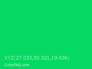 XYZ 27.033,50.521,19.636 Color is a normal green color and the nearest color is Malachite #0bda51. Hex code #05d961 and RGB value is rgb(5,217,97). In RGB color space, this color is composed of 2% red, 85% green, 38% blue, In CMYK color space, this color is composed of 98% cyan, 0% magenta, 55% yellow , 15% black , In HSL color space, this color has a hue angle of 146° , 95% saturation and 44% lightness.