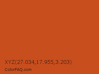 XYZ 27.034,17.955,3.203 Color is a normal orange color and the nearest color is Orange Roughy #c45719. Hex code #c94e1d and RGB value is rgb(201,78,29). In RGB color space, this color is composed of 79% red, 31% green, 11% blue, In CMYK color space, this color is composed of 0% cyan, 61% magenta, 86% yellow , 21% black , In HSL color space, this color has a hue angle of 17° , 75% saturation and 45% lightness.