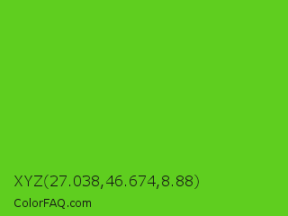 XYZ 27.038,46.674,8.88 Color is a normal green color and the nearest color is Harlequin Green #46cb18. Hex code #5fce1f and RGB value is rgb(95,206,31). In RGB color space, this color is composed of 37% red, 81% green, 12% blue, In CMYK color space, this color is composed of 54% cyan, 0% magenta, 85% yellow , 19% black , In HSL color space, this color has a hue angle of 98° , 74% saturation and 46% lightness.
