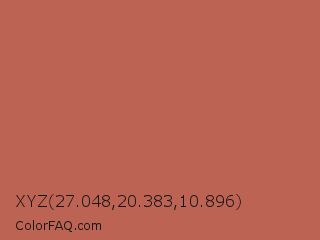 XYZ 27.048,20.383,10.896 Color is a normal red color and the nearest color is Matrix #b05d54. Hex code #bd6354 and RGB value is rgb(189,99,84). In RGB color space, this color is composed of 74% red, 39% green, 33% blue, In CMYK color space, this color is composed of 0% cyan, 48% magenta, 56% yellow , 26% black , In HSL color space, this color has a hue angle of 9° , 44% saturation and 54% lightness.