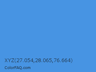 XYZ 27.054,28.065,76.664 Color is a normal blue color and the nearest color is Tufts Blue #3e8ede. Hex code #4794e3 and RGB value is rgb(71,148,227). In RGB color space, this color is composed of 28% red, 58% green, 89% blue, In CMYK color space, this color is composed of 69% cyan, 35% magenta, 0% yellow , 11% black , In HSL color space, this color has a hue angle of 210° , 74% saturation and 58% lightness.