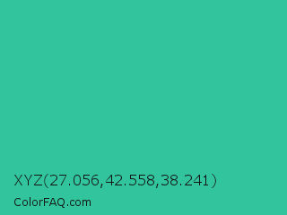XYZ 27.056,42.558,38.241 Color is a normal cyan color and the nearest color is Shamrock #33cc99. Hex code #32c49c and RGB value is rgb(50,196,156). In RGB color space, this color is composed of 20% red, 77% green, 61% blue, In CMYK color space, this color is composed of 74% cyan, 0% magenta, 20% yellow , 23% black , In HSL color space, this color has a hue angle of 164° , 59% saturation and 48% lightness.