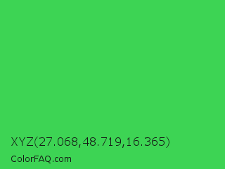 XYZ 27.068,48.719,16.365 Color is a normal green color and the nearest color is UFO Green #3cd070. Hex code #3dd454 and RGB value is rgb(61,212,84). In RGB color space, this color is composed of 24% red, 83% green, 33% blue, In CMYK color space, this color is composed of 71% cyan, 0% magenta, 60% yellow , 17% black , In HSL color space, this color has a hue angle of 129° , 64% saturation and 54% lightness.