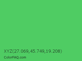 XYZ 27.069,45.749,19.208 Color is a normal green color and the nearest color is Emerald #50c878. Hex code #4fcc63 and RGB value is rgb(79,204,99). In RGB color space, this color is composed of 31% red, 80% green, 39% blue, In CMYK color space, this color is composed of 61% cyan, 0% magenta, 51% yellow , 20% black , In HSL color space, this color has a hue angle of 130° , 55% saturation and 55% lightness.