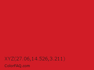 XYZ 27.06,14.526,3.211 Color is a normal red color and the nearest color is Fire Engine Red #ce2029. Hex code #d11c26 and RGB value is rgb(209,28,38). In RGB color space, this color is composed of 82% red, 11% green, 15% blue, In CMYK color space, this color is composed of 0% cyan, 87% magenta, 82% yellow , 18% black , In HSL color space, this color has a hue angle of 357° , 76% saturation and 46% lightness.