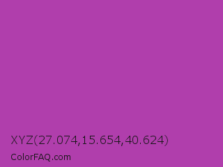 XYZ 27.074,15.654,40.624 Color is a normal magenta color and the nearest color is Byzantine #bd33a4. Hex code #b03eac and RGB value is rgb(176,62,172). In RGB color space, this color is composed of 69% red, 24% green, 67% blue, In CMYK color space, this color is composed of 0% cyan, 65% magenta, 2% yellow , 31% black , In HSL color space, this color has a hue angle of 302° , 48% saturation and 47% lightness.