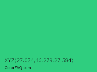 XYZ 27.074,46.279,27.584 Color is a normal green color and the nearest color is UFO Green #3cd070. Hex code #2fce7f and RGB value is rgb(47,206,127). In RGB color space, this color is composed of 18% red, 81% green, 50% blue, In CMYK color space, this color is composed of 77% cyan, 0% magenta, 38% yellow , 19% black , In HSL color space, this color has a hue angle of 150° , 63% saturation and 50% lightness.