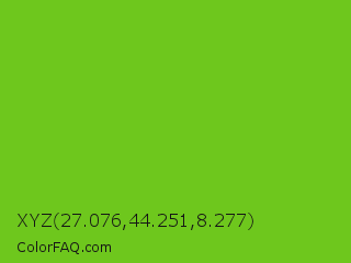 XYZ 27.076,44.251,8.277 Color is a normal green color and the nearest color is Lima #76bd17. Hex code #6ec71d and RGB value is rgb(110,199,29). In RGB color space, this color is composed of 43% red, 78% green, 11% blue, In CMYK color space, this color is composed of 45% cyan, 0% magenta, 85% yellow , 22% black , In HSL color space, this color has a hue angle of 91° , 75% saturation and 45% lightness.