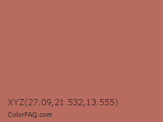 XYZ 27.09,21.532,13.555 Color is a normal red color and the nearest color is Santa Fe #b16d52. Hex code #b86b5f and RGB value is rgb(184,107,95). In RGB color space, this color is composed of 72% red, 42% green, 37% blue, In CMYK color space, this color is composed of 0% cyan, 42% magenta, 48% yellow , 28% black , In HSL color space, this color has a hue angle of 8° , 39% saturation and 55% lightness.