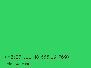 XYZ 27.111,48.666,19.769 Color is a normal green color and the nearest color is UFO Green #3cd070. Hex code #32d463 and RGB value is rgb(50,212,99). In RGB color space, this color is composed of 20% red, 83% green, 39% blue, In CMYK color space, this color is composed of 76% cyan, 0% magenta, 53% yellow , 17% black , In HSL color space, this color has a hue angle of 138° , 65% saturation and 51% lightness.