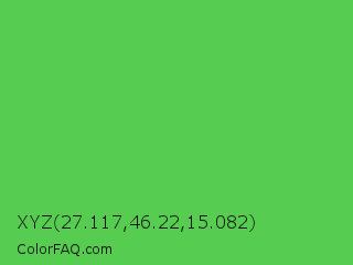 XYZ 27.117,46.22,15.082 Color is a normal green color and the nearest color is Fern #63b76c. Hex code #56cd50 and RGB value is rgb(86,205,80). In RGB color space, this color is composed of 34% red, 80% green, 31% blue, In CMYK color space, this color is composed of 58% cyan, 0% magenta, 61% yellow , 20% black , In HSL color space, this color has a hue angle of 117° , 56% saturation and 56% lightness.