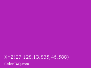 XYZ 27.128,13.835,46.588 Color is a normal magenta color and the nearest color is Byzantine #bd33a4. Hex code #b022b8 and RGB value is rgb(176,34,184). In RGB color space, this color is composed of 69% red, 13% green, 72% blue, In CMYK color space, this color is composed of 4% cyan, 82% magenta, 0% yellow , 28% black , In HSL color space, this color has a hue angle of 297° , 69% saturation and 43% lightness.