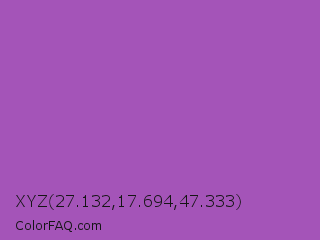 XYZ 27.132,17.694,47.333 Color is a normal purple color and the nearest color is Purple Plum #9c51b6. Hex code #a454b8 and RGB value is rgb(164,84,184). In RGB color space, this color is composed of 64% red, 33% green, 72% blue, In CMYK color space, this color is composed of 11% cyan, 54% magenta, 0% yellow , 28% black , In HSL color space, this color has a hue angle of 288° , 41% saturation and 53% lightness.