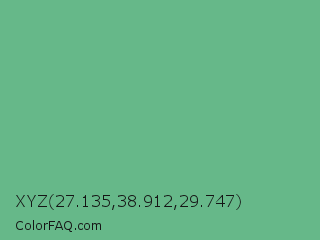 XYZ 27.135,38.912,29.747 Color is a normal green color and the nearest color is Silver Tree #66b58f. Hex code #66b889 and RGB value is rgb(102,184,137). In RGB color space, this color is composed of 40% red, 72% green, 54% blue, In CMYK color space, this color is composed of 45% cyan, 0% magenta, 26% yellow , 28% black , In HSL color space, this color has a hue angle of 146° , 37% saturation and 56% lightness.