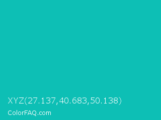 XYZ 27.137,40.683,50.138 Color is a normal cyan color and the nearest color is Tiffany Blue #0abab5. Hex code #0dbfb5 and RGB value is rgb(13,191,181). In RGB color space, this color is composed of 5% red, 75% green, 71% blue, In CMYK color space, this color is composed of 93% cyan, 0% magenta, 5% yellow , 25% black , In HSL color space, this color has a hue angle of 177° , 87% saturation and 40% lightness.