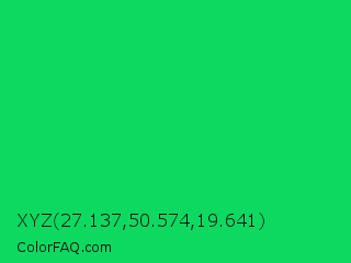 XYZ 27.137,50.574,19.641 Color is a normal green color and the nearest color is Malachite #0bda51. Hex code #0dd961 and RGB value is rgb(13,217,97). In RGB color space, this color is composed of 5% red, 85% green, 38% blue, In CMYK color space, this color is composed of 94% cyan, 0% magenta, 55% yellow , 15% black , In HSL color space, this color has a hue angle of 145° , 89% saturation and 45% lightness.