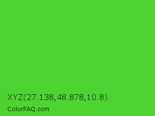 XYZ 27.138,48.878,10.8 Color is a normal green color and the nearest color is Harlequin Green #46cb18. Hex code #4dd430 and RGB value is rgb(77,212,48). In RGB color space, this color is composed of 30% red, 83% green, 19% blue, In CMYK color space, this color is composed of 64% cyan, 0% magenta, 77% yellow , 17% black , In HSL color space, this color has a hue angle of 109° , 66% saturation and 51% lightness.