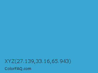 XYZ 27.139,33.16,65.943 Color is a normal blue color and the nearest color is Maximum Blue #47abcc. Hex code #39a7d2 and RGB value is rgb(57,167,210). In RGB color space, this color is composed of 22% red, 65% green, 82% blue, In CMYK color space, this color is composed of 73% cyan, 20% magenta, 0% yellow , 18% black , In HSL color space, this color has a hue angle of 197° , 63% saturation and 52% lightness.