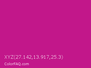 XYZ 27.142,13.917,25.3 Color is a normal magenta color and the nearest color is Red Violet #c71585. Hex code #c2178a and RGB value is rgb(194,23,138). In RGB color space, this color is composed of 76% red, 9% green, 54% blue, In CMYK color space, this color is composed of 0% cyan, 88% magenta, 29% yellow , 24% black , In HSL color space, this color has a hue angle of 320° , 79% saturation and 43% lightness.