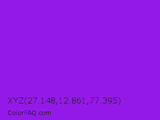 XYZ 27.148,12.861,77.395 Color is a normal purple color and the nearest color is Veronica #a020f0. Hex code #941ae8 and RGB value is rgb(148,26,232). In RGB color space, this color is composed of 58% red, 10% green, 91% blue, In CMYK color space, this color is composed of 36% cyan, 89% magenta, 0% yellow , 9% black , In HSL color space, this color has a hue angle of 276° , 82% saturation and 51% lightness.