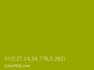 XYZ 27.14,34.778,5.282 Color is a normal yellow color and the nearest color is Apple Green #8db600. Hex code #99a800 and RGB value is rgb(153,168,0). In RGB color space, this color is composed of 60% red, 66% green, 0% blue, In CMYK color space, this color is composed of 9% cyan, 0% magenta, 100% yellow , 34% black , In HSL color space, this color has a hue angle of 65° , 100% saturation and 33% lightness.