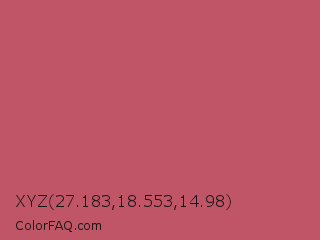 XYZ 27.183,18.553,14.98 Color is a normal red color and the nearest color is Popstar #be4f62. Hex code #bf5567 and RGB value is rgb(191,85,103). In RGB color space, this color is composed of 75% red, 33% green, 40% blue, In CMYK color space, this color is composed of 0% cyan, 55% magenta, 46% yellow , 25% black , In HSL color space, this color has a hue angle of 350° , 45% saturation and 54% lightness.