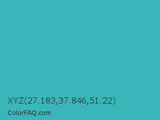 XYZ 27.183,37.846,51.22 Color is a normal cyan color and the nearest color is Verdigris #43b3ae. Hex code #3bb6b8 and RGB value is rgb(59,182,184). In RGB color space, this color is composed of 23% red, 71% green, 72% blue, In CMYK color space, this color is composed of 68% cyan, 1% magenta, 0% yellow , 28% black , In HSL color space, this color has a hue angle of 181° , 51% saturation and 48% lightness.