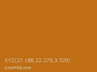 XYZ 27.188,22.279,3.529 Color is a normal orange color and the nearest color is Bourbon #ba6f1e. Hex code #bf6e14 and RGB value is rgb(191,110,20). In RGB color space, this color is composed of 75% red, 43% green, 8% blue, In CMYK color space, this color is composed of 0% cyan, 42% magenta, 90% yellow , 25% black , In HSL color space, this color has a hue angle of 32° , 81% saturation and 41% lightness.