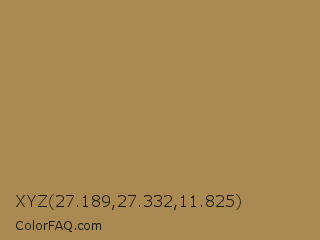 XYZ 27.189,27.332,11.825 Color is a normal orange color and the nearest color is Limed Oak #ac8a56. Hex code #aa8a52 and RGB value is rgb(170,138,82). In RGB color space, this color is composed of 67% red, 54% green, 32% blue, In CMYK color space, this color is composed of 0% cyan, 19% magenta, 52% yellow , 33% black , In HSL color space, this color has a hue angle of 38° , 35% saturation and 49% lightness.