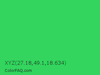 XYZ 27.18,49.1,18.634 Color is a normal green color and the nearest color is UFO Green #3cd070. Hex code #33d55e and RGB value is rgb(51,213,94). In RGB color space, this color is composed of 20% red, 84% green, 37% blue, In CMYK color space, this color is composed of 76% cyan, 0% magenta, 56% yellow , 16% black , In HSL color space, this color has a hue angle of 136° , 66% saturation and 52% lightness.