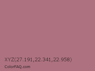 XYZ 27.191,22.341,22.958 Color is a normal red color and the nearest color is Turkish Rose #b57281. Hex code #ae717f and RGB value is rgb(174,113,127). In RGB color space, this color is composed of 68% red, 44% green, 50% blue, In CMYK color space, this color is composed of 0% cyan, 35% magenta, 27% yellow , 32% black , In HSL color space, this color has a hue angle of 346° , 27% saturation and 56% lightness.