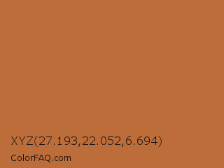 XYZ 27.193,22.052,6.694 Color is a normal orange color and the nearest color is Copper #b87333. Hex code #bd6d39 and RGB value is rgb(189,109,57). In RGB color space, this color is composed of 74% red, 43% green, 22% blue, In CMYK color space, this color is composed of 0% cyan, 42% magenta, 70% yellow , 26% black , In HSL color space, this color has a hue angle of 24° , 54% saturation and 48% lightness.