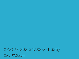 XYZ 27.202,34.906,64.335 Color is a normal cyan color and the nearest color is Ball Blue #21abcd. Hex code #2badcf and RGB value is rgb(43,173,207). In RGB color space, this color is composed of 17% red, 68% green, 81% blue, In CMYK color space, this color is composed of 79% cyan, 16% magenta, 0% yellow , 19% black , In HSL color space, this color has a hue angle of 192° , 66% saturation and 49% lightness.