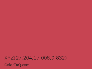 XYZ 27.204,17.008,9.832 Color is a normal red color and the nearest color is Brick Red #cb4154. Hex code #c74552 and RGB value is rgb(199,69,82). In RGB color space, this color is composed of 78% red, 27% green, 32% blue, In CMYK color space, this color is composed of 0% cyan, 65% magenta, 59% yellow , 22% black , In HSL color space, this color has a hue angle of 354° , 54% saturation and 53% lightness.