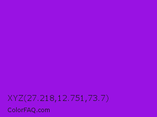 XYZ 27.218,12.751,73.7 Color is a normal purple color and the nearest color is Veronica #a020f0. Hex code #9912e3 and RGB value is rgb(153,18,227). In RGB color space, this color is composed of 60% red, 7% green, 89% blue, In CMYK color space, this color is composed of 33% cyan, 92% magenta, 0% yellow , 11% black , In HSL color space, this color has a hue angle of 279° , 85% saturation and 48% lightness.