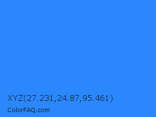 XYZ 27.231,24.87,95.461 Color is a normal blue color and the nearest color is Dodger Blue #1e90ff. Hex code #2b87fc and RGB value is rgb(43,135,252). In RGB color space, this color is composed of 17% red, 53% green, 99% blue, In CMYK color space, this color is composed of 83% cyan, 46% magenta, 0% yellow , 1% black , In HSL color space, this color has a hue angle of 214° , 97% saturation and 58% lightness.