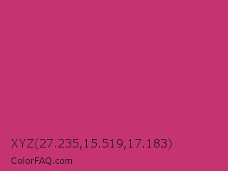XYZ 27.235,15.519,17.183 Color is a normal rose color and the nearest color is Telemagenta #cf3476. Hex code #c53471 and RGB value is rgb(197,52,113). In RGB color space, this color is composed of 77% red, 20% green, 44% blue, In CMYK color space, this color is composed of 0% cyan, 74% magenta, 43% yellow , 23% black , In HSL color space, this color has a hue angle of 335° , 58% saturation and 49% lightness.