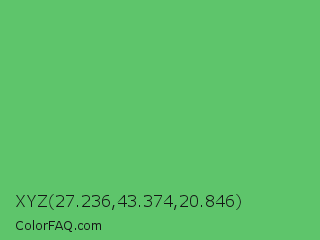 XYZ 27.236,43.374,20.846 Color is a normal green color and the nearest color is Fern #63b76c. Hex code #5ec56b and RGB value is rgb(94,197,107). In RGB color space, this color is composed of 37% red, 77% green, 42% blue, In CMYK color space, this color is composed of 52% cyan, 0% magenta, 46% yellow , 23% black , In HSL color space, this color has a hue angle of 128° , 47% saturation and 57% lightness.