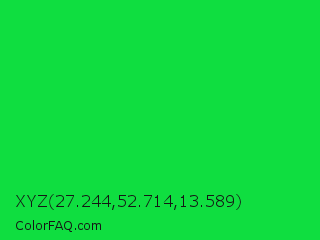 XYZ 27.244,52.714,13.589 Color is a normal green color and the nearest color is Malachite #0bda51. Hex code #0fde40 and RGB value is rgb(15,222,64). In RGB color space, this color is composed of 6% red, 87% green, 25% blue, In CMYK color space, this color is composed of 93% cyan, 0% magenta, 71% yellow , 13% black , In HSL color space, this color has a hue angle of 134° , 87% saturation and 46% lightness.