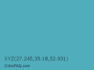 XYZ 27.245,35.18,52.931 Color is a normal cyan color and the nearest color is Fountain Blue #56b4be. Hex code #4fadbc and RGB value is rgb(79,173,188). In RGB color space, this color is composed of 31% red, 68% green, 74% blue, In CMYK color space, this color is composed of 58% cyan, 8% magenta, 0% yellow , 26% black , In HSL color space, this color has a hue angle of 188° , 45% saturation and 52% lightness.