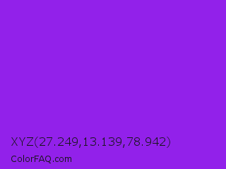 XYZ 27.249,13.139,78.942 Color is a normal purple color and the nearest color is Blue Violet #8a2be2. Hex code #9221ea and RGB value is rgb(146,33,234). In RGB color space, this color is composed of 57% red, 13% green, 92% blue, In CMYK color space, this color is composed of 38% cyan, 86% magenta, 0% yellow , 8% black , In HSL color space, this color has a hue angle of 274° , 83% saturation and 52% lightness.