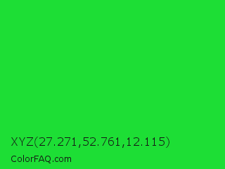 XYZ 27.271,52.761,12.115 Color is a normal green color and the nearest color is Lime Green #32cd32. Hex code #1dde35 and RGB value is rgb(29,222,53). In RGB color space, this color is composed of 11% red, 87% green, 21% blue, In CMYK color space, this color is composed of 87% cyan, 0% magenta, 76% yellow , 13% black , In HSL color space, this color has a hue angle of 127° , 77% saturation and 49% lightness.