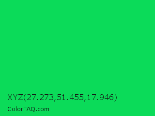 XYZ 27.273,51.455,17.946 Color is a normal green color and the nearest color is Malachite #0bda51. Hex code #0bdb59 and RGB value is rgb(11,219,89). In RGB color space, this color is composed of 4% red, 86% green, 35% blue, In CMYK color space, this color is composed of 95% cyan, 0% magenta, 59% yellow , 14% black , In HSL color space, this color has a hue angle of 143° , 90% saturation and 45% lightness.