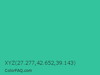 XYZ 27.277,42.652,39.143 Color is a normal cyan color and the nearest color is Shamrock #33cc99. Hex code #33c49e and RGB value is rgb(51,196,158). In RGB color space, this color is composed of 20% red, 77% green, 62% blue, In CMYK color space, this color is composed of 74% cyan, 0% magenta, 19% yellow , 23% black , In HSL color space, this color has a hue angle of 164° , 59% saturation and 48% lightness.
