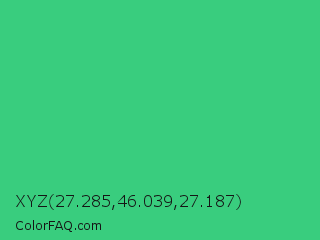 XYZ 27.285,46.039,27.187 Color is a normal green color and the nearest color is UFO Green #3cd070. Hex code #39cd7e and RGB value is rgb(57,205,126). In RGB color space, this color is composed of 22% red, 80% green, 49% blue, In CMYK color space, this color is composed of 72% cyan, 0% magenta, 39% yellow , 20% black , In HSL color space, this color has a hue angle of 148° , 60% saturation and 51% lightness.