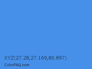 XYZ 27.28,27.169,80.897 Color is a normal blue color and the nearest color is Tufts Blue #3e8ede. Hex code #4790e9 and RGB value is rgb(71,144,233). In RGB color space, this color is composed of 28% red, 56% green, 91% blue, In CMYK color space, this color is composed of 70% cyan, 38% magenta, 0% yellow , 9% black , In HSL color space, this color has a hue angle of 213° , 79% saturation and 60% lightness.