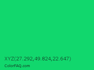 XYZ 27.292,49.824,22.647 Color is a normal green color and the nearest color is Malachite #0bda51. Hex code #11d76d and RGB value is rgb(17,215,109). In RGB color space, this color is composed of 7% red, 84% green, 43% blue, In CMYK color space, this color is composed of 92% cyan, 0% magenta, 49% yellow , 16% black , In HSL color space, this color has a hue angle of 148° , 85% saturation and 45% lightness.
